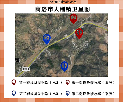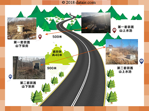 第二套设备泵房位于县道下方的河道,与水池距离稍远并且有约40米高的山包遮挡,直线距离约900米。发射端水池直径5米、深度2.5米,现场没有电力供应,并且距离现场1.5KM为大型光伏发电站。