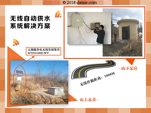PLC无线通讯专家选用两套DTD110HCWY达泰太阳能供电无线自动供水装置来完成此次无线传输任务。由于水池端无法提供电源,因此发射端需采用太阳能供电。